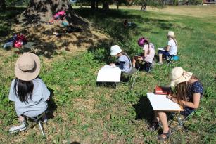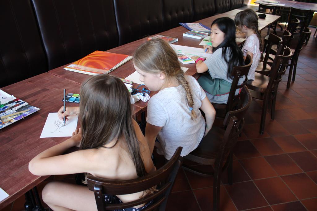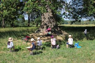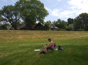 An der Elbe fanden wir eine unberührte Natur-Oase, in der wir so gut wie nie auf andere Menschen trafen. Die Elbestrände zeigten sich in unterschiedlichen Braun- und Ockertönen und luden nicht nur zum Zeichnen ein, sondern auch zu einem Bad im Fluss. Einmal am Tag arbeiteten wir mit Akt-Modell in der Landschaft oder im Haus, mit Ausnahme eines Tages zur Mitte der Woche. Die restliche Zeit suchte jeder seine bevorzugten Orte zum Zeichnen/Malen auf oder erkundete die Gegend entland des Deiches. Im Landhaus Lenzener Elbtalaue hatten wir einen wunderbaren Bewegungsraum mit hohen Decken und Holzfußboden zum Arbeiten mit dem Modell an kalten Tagen und für morgendliche Schwert- und Yogaübungen einzelner Teilnehmer. Die Kinder genossen die Abgeschiedeneheit von der Stadt, "verirrten" sich im Schilf des Brackwassersees, wateten durch Ufer-Matsch oder zeichneten unter 800jährigen Eichen. Das Gelände des Hauses bot auch allerlei Zerstreuung in der Zeit zwischen den Arbeitsphasen mit Trampolin, Schaukeln, Tischtennis und Grünflächen. Das Herzstück der Sommerakademie - die allabendlichen Arbeitsbesprechungen - brachten wieder spannende Diskusionen zu Tage und halfen allen ein großes Stück voran zu kommen auf ihrem individuellen künstlerischen Weg.